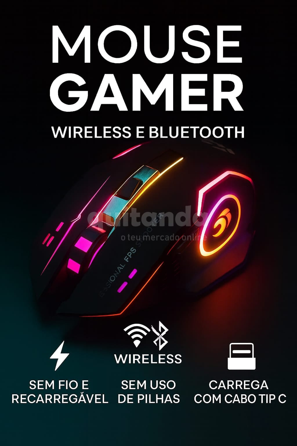 Mouse Gamer Sem Fio Profissional (Recarregável) com desempenho profissional, ideal para jogos FPS e uso diário, disponível para venda,